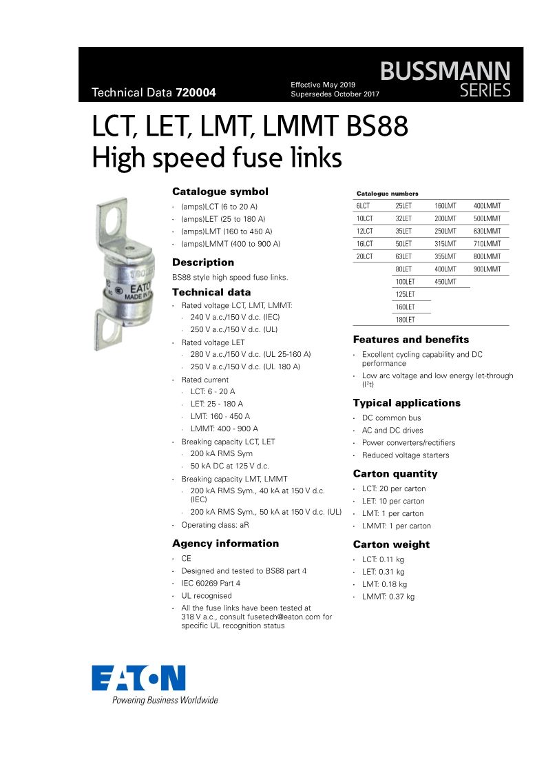 Agency Information: CE, Designed and tested to: BS 88 Part 4, IEC 269 Part 4, UL Recognized. All fuses above have been tested at 318Vac. Consult Cooper Bussmann for specific UL Recognition status.