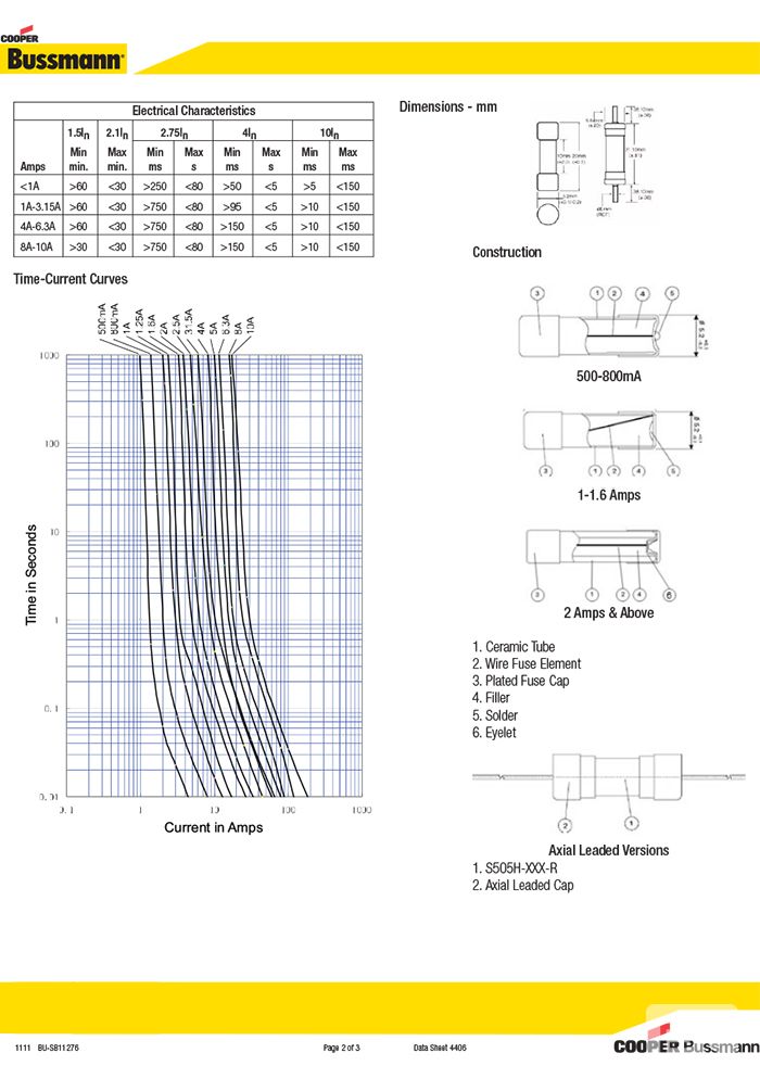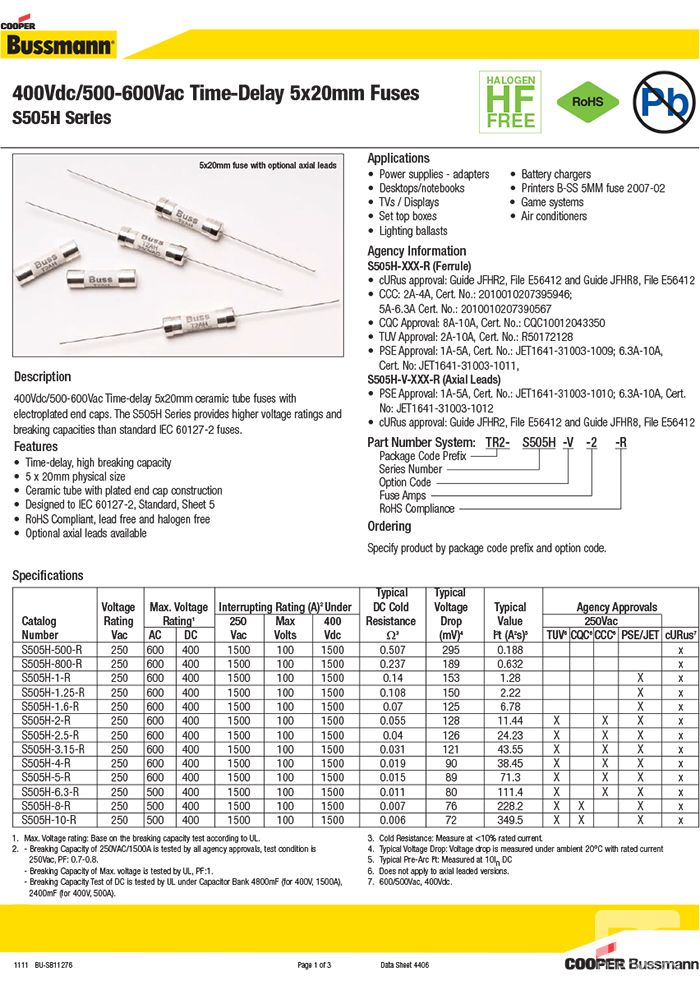 BUSSMANN S505H系列 慢断陶瓷保险丝 500VAC 5*20mm