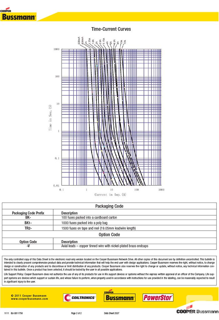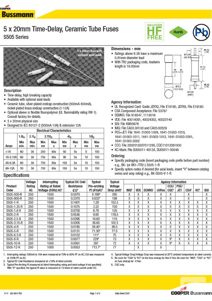BUSSMANN S505H系列 慢断陶瓷保险丝 500VAC 5*20mm