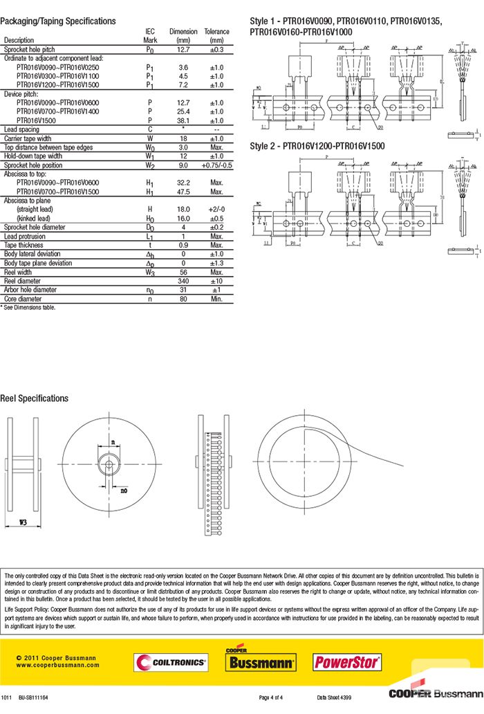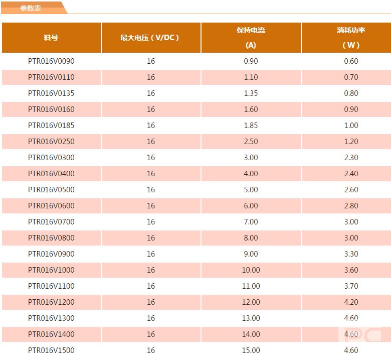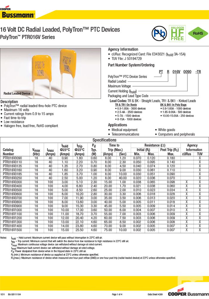 bussmann PTR016V系列 自恢复插件保险丝 黄色可恢复
